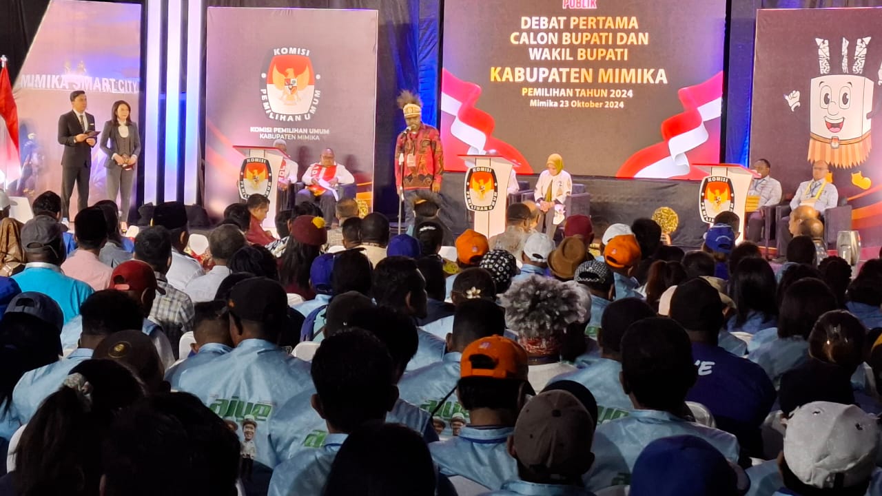 TIMIKA – Komisi Pemilihan Umum (KPU) Kabupaten Mimika menggelar debat terbuka pertama, di Gor Futsal yang berlokasi di jalan Poros SP2-SP5, Kelurahan Hangaijti, Distrik Mimika Baru, Rabu (23/10).