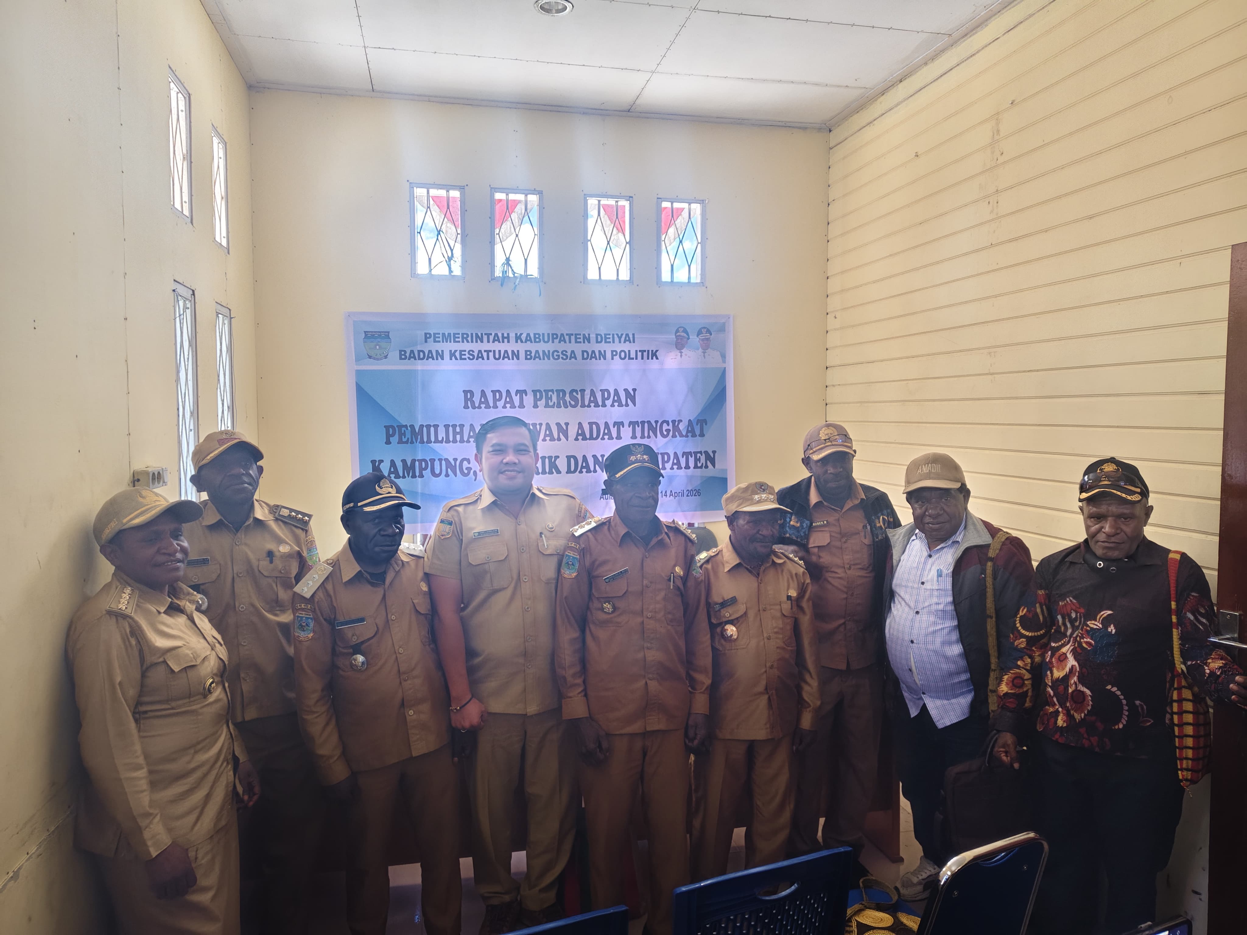 Deiyai — Badan Kesatuan Bangsa dan Politik (Kesbangpol) Kabupaten Deiyai menggelar rapat persiapan pemilihan Dewan Adat tingkat kampung, distrik, hingga kabupaten bersama lima kepala distrik dan sejumlah kepala kampung. Kegiatan tersebut berlangsung di ruang pertemuan pada Selasa (14/4/2026).